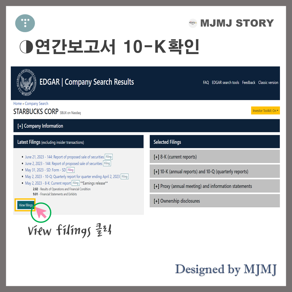이렇게 검색창에 SBUX를 입력해서 검색을 하면 10-K를 확인할 수 있는 페이지로 들어오는데 여기서 View filings 버튼을 클릭하신후 10-K 보고서를 찾아 filing 버튼을 클릭하여 읽어 보시면 됩니다. 그런데 사실 이용방법은 간단하지만 10-K는 투자시 중요한 자료이므로 꼼꼼히 살펴보실 필요가 있으며 보통 스타벅스의 경우 애뉴얼 리포트를 10-K에 커버만 추가하여 공시한다고 하니 참고 바랍니다
